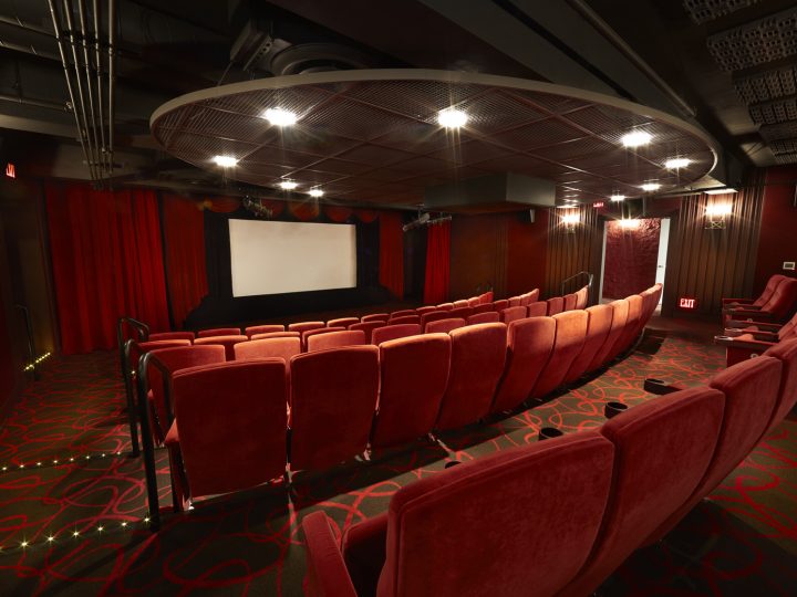 There are 49 seats in the fixed balcony and 125 seats in the stadium-style retractable section, including 5 wheelchair spaces. Theatre 2’s screen is 10’2” high x 24’ wide.Theatre 2 is equipped for 2K digital projection only. Row A is approximately 12’ from the screen.